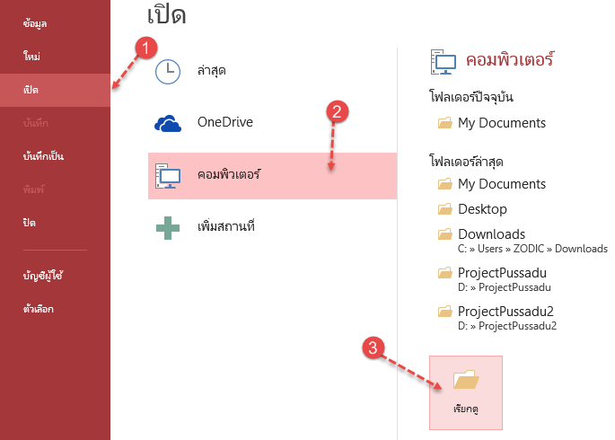 2) ไปที่ เปิด ตามหมายเลข 1 จากนั้นไปที่ ล่าสุด ตามหมายเลข 2 แล้วจากนั้นก็เลือกฐานข้อมูลที่เราใช้งานล่าสุดที่ต้องการ เลือกตามหมายเลข 3