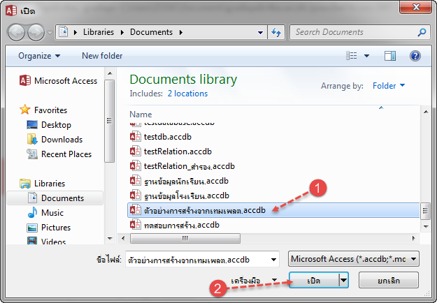 4) เลือกฐานข้อมูลที่ต้องการจะเปิดตามหมายเลข 1 จากนั้นคลิกเปิด ตามหมายเลข 2