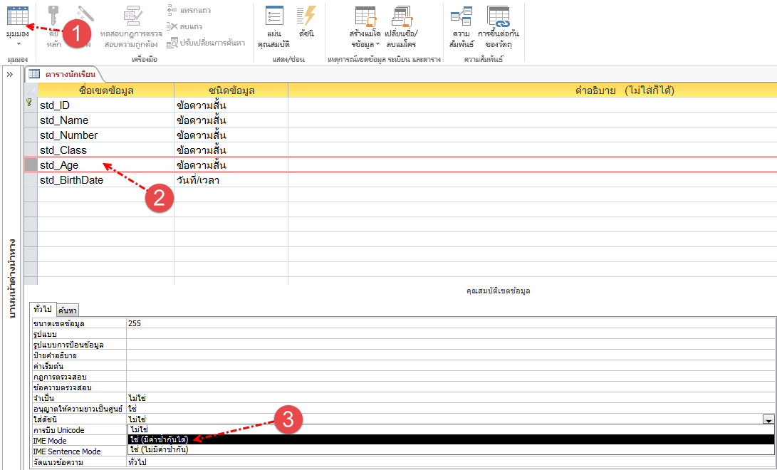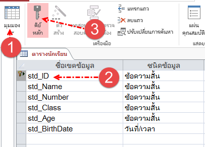 ขั้นตอนที่ 3 เมื่อเลือกฟิลด์ที่ต้องการเป็นคีย์หลักแล้วกดปุ่มตามหมายเลข 3 คือปุ่มคีย์หลัก เป็นอันเสร็จสิ้นการกำหนดคีย์หลัก เมื่อกำหนดฟิลด์ที่เป็นคีย์หลักเสร็จแล้วจะมีรูปลูกกุญแจอยู่หน้าฟิลด์