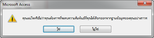 3. เลือกความสัมพันธ์ที่ต้องการลบ จากนั้นกำการกดปุ่ม Delete บนแป้นพิมพ์ จะปรากฏหน้าจอยืนยันการลบความสัมพันธ์ ให้กด ใช่ ถ้าต้องการลบ หรือ กด ไม่ใช่ ถ้าไม่ต้องการลบ เมื่อกดใช่จะทำให้เส้นความสัมพันธ์ขอข้อมูลหายไปเป็นอันเสร็จสิ้นการลบความสัมพันธ์ระหว่างสองตาราง