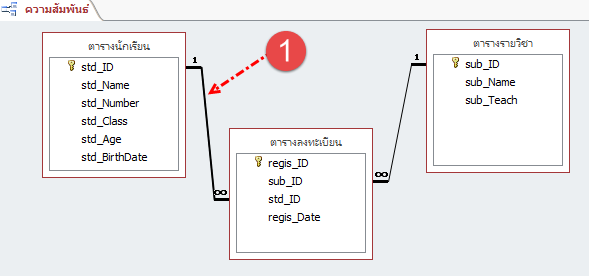 ถ้าเราไม่ต้องการใช้งานข้อมูลร่วมกันระหว่างตารางแล้ว เราสามารถลบความสัมพันธ์ระหว่างตารางได้ โดยการลบเส้นความสัมพันธ์ออก จะทำให้ข้อมูลของตารางทั้งสองไม่มีความสัมพันธ์กันอีกต่อไป