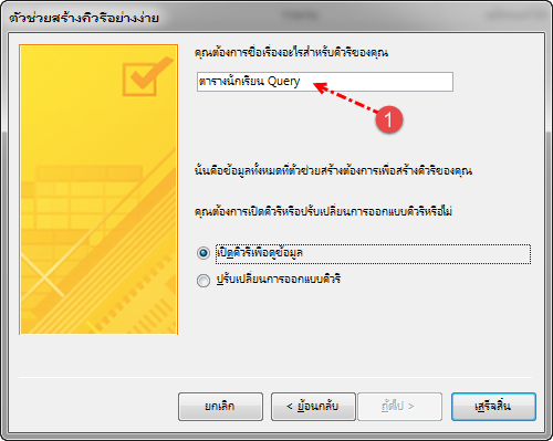 9. ตั้งชื่อคิวรี ตามต้องการ ตามหมายเลข 1 จากนั้นกดปุ่มเสร็จสิ้น
