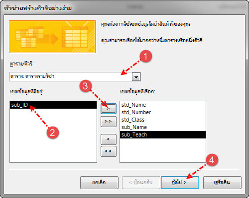 6. เมื่อเลือกฟิลด์ที่ต้องการสร้างคิวรี เรียบร้อยแล้วให้กดปุ่ม ตามหมายเลข 3 เพื่อให้ฟิลด์ที่ต้องการแสดงข้อมูลไปอยู่ใน เขตข้อมูลที่เลือก