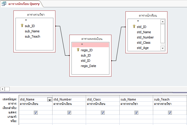 เป็นอันเสร็จสิ้นการสร้างคิวรีข้อมูลที่ต้องการ โดยข้อมูลที่อยู่ในกรอบสีฟ้าเป็นข้อมูลจากตารางนักเรียน ส่วนข้อมูลที่อยู่ในกรอบสีแดงเป็นข้อมูลที่อยู่ในตารางรายวิชา ซึ่งทั้งสองตารางมีความสัมพันธ์กัน แบบ Many-to-Many (M:N) โดยมีตารางลงทะเบียนเป็นตารางเชื่อมนั่นเอง