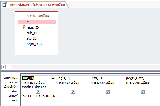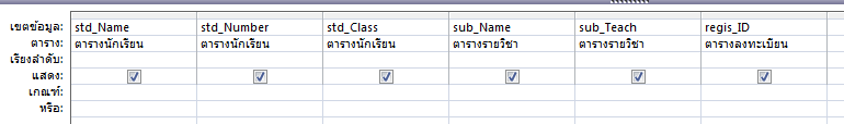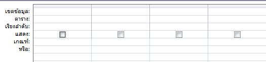 - แสดง ใช้สำหรับคลิกเลือกให้แสดงหรือไม่แสดงข้อมูลในฟิลด์ เมื่อสั่งแสดงผลลัพธ์ เช่นบางฟิลด์อาจใช้จัดเรียงข้อมูลอย่างเดียว เป็นต้น