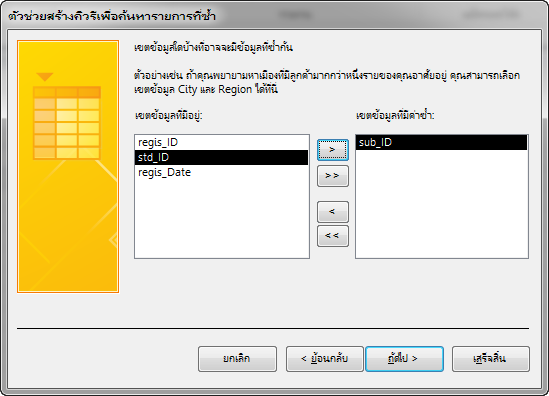 4. เลือกฟิลด์ที่ต้องการดูข้อมูลซ้ำกัน ในตัวอย่างเลือกฟิลด์ sub_ID จากนั้นกด ถัดไป