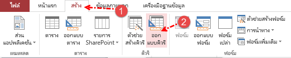 1. ไปที่แท็บ สร้าง ตามหมายเลข 1 คลิกปุ่ม ออกแบบคิวรี ตามหมายเลข 2