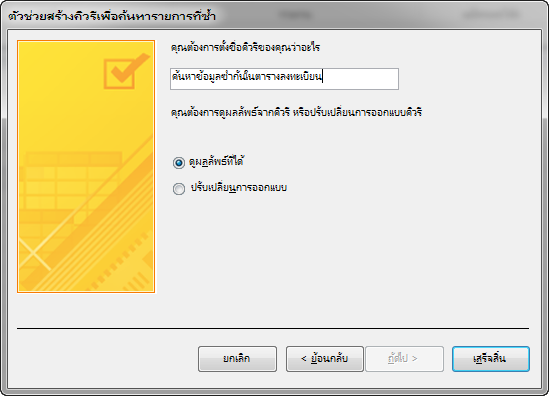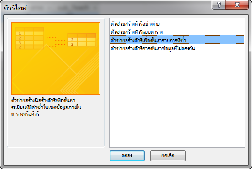 การสร้างคิวรีด้วยตัวช่วยสร้างคิวรีเพื่อค้นหารายการที่ซ้ำ