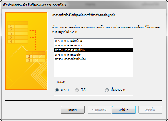 3. คลิกเลือกตารางที่ต้องการสร้างคิวรี เพื่อหาเขตข้อมูลที่ซ้ำ