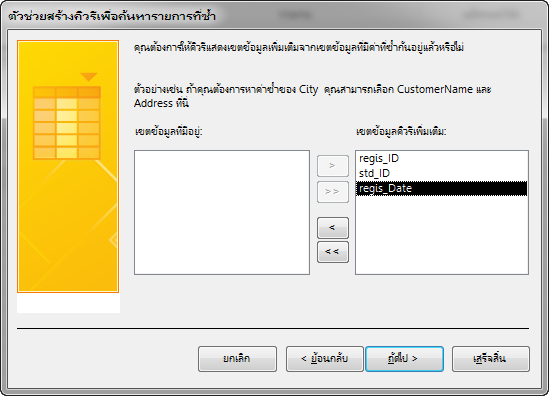 5. เลือกฟิลด์สำหรับโชว์ข้อมูลของฟิลด์ที่ซ้ำกัน ในตัวอย่างเลือกทุกฟิลด์ในตารางลงทะเบียน จากนั้นกด ถัดไป