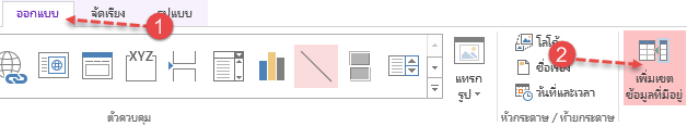 2) เพิ่มส่วนหัวฟอร์มและส่วนท้ายฟอร์ม จากนั้นเพิ่มข้อมูลส่วนหัวให้เรียบร้อย แล้วทำการเพิ่มฟิลด์ข้อมูลที่ต้องการเพิ่มข้อมูลลงในตารางโดย ไปที่ แท็บออกแบบตามหมายเลข 1 จากนั้นไปที่ เพิ่มเขตข้อมูลที่มีอยู่