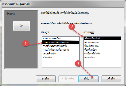 5) จากนั้นคลิกตรงตำแหน่งที่เราต้องการสร้างปุ่มที่ฟอร์ม จะปรากฏหน้าจอ ดังภาพ เลือกการดำเนินการกับระเบียนตามหมายเลข 1 จากนั้นเลือกเพิ่มระเบียนใหม่ตามหมายเลข 2 จากนั้นกดปุ่มถัดไปตามหมายเลข 3