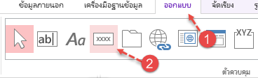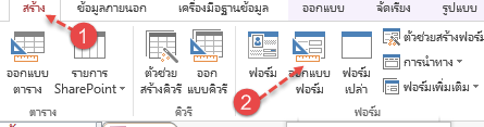 4) จากนั้นสร้างปุ่มเพิ่มระเบียนใหม่ โดยไปที่แท็บออกแบบตามหมายเลข 1 จากนั้นไปที่ปุ่มตามหมายเลข 2