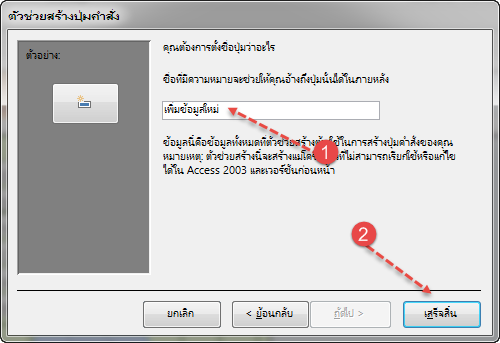 7) ตั้งชื่อปุ่มเพิ่มข้อมูลใหม่ตามหมายเลข 1 จากนั้นกดเสร็จสิ้นตามหมายเลข 2