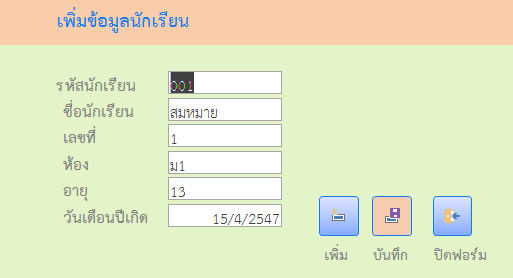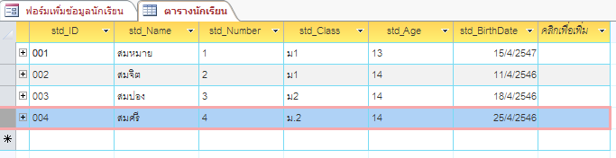 จะเห็นได้ว่าเมื่อเราไปที่มุมมองฟอร์มจะมีข้อมูลเดิมโชว์ขึ้นมา และเมื่อเราต้องการเพิ่มข้อมูลให้ก็ให้คลิกปุ่มเพิ่ม แล้วก็จะสามารถกรอกข้อมูลใหม่ลงไปจากนั้นก็กดบันทึกเพื่อบันทึกข้อมูลลงตาราง ข้อมูลใหม่ก็จะบันทึกลงในตารางนักเรียน ดังภาพ