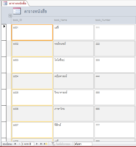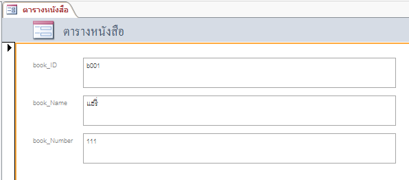 - มุมมองฟอร์ม แสดงผลเรคคอร์ดข้อมูลจากแหล่งข้อมูล สามารถเพิ่ม ลบ แก้ไข ได้เหมือนกับมุมมองแผ่นข้อมูล