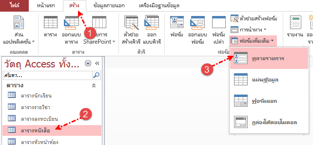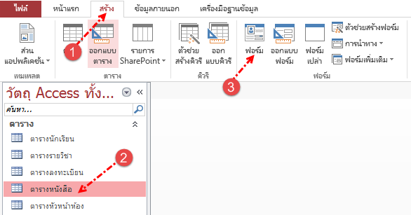 1. คลิกแท็บ สร้าง ตามหมายเลข 1 จากนั้นคลิกเลือกตารางตามหมายเลข 2 จากนั้นคลิกปุ่ม ฟอร์ม ตามหมายเลข 3
