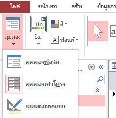 -มุมมองออกแบบ ใช้สำหรับสร้างและแก้ไขแบบฟอร์ม ซึ่งอาจเป็นฟอร์มว่างๆหรือฟอร์มสำเร็จรูปที่สร้างขึ้น เพื่อแก้ไข ตกแต่งให้สวยงาม