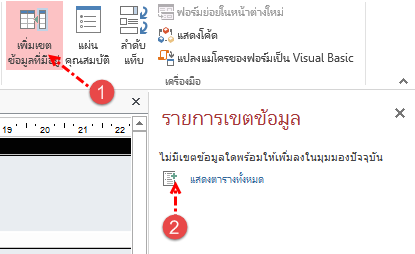 1. คลิกแท็บออกแบบแล้วคลิกปุ่มเพิ่มเขตข้อมูลที่มีอยู่ตามหมายเลข 1 จะปรากฏรายการเขตข้อมูล จากนั้นเลือกแสดงตารางทั้งหมดตามหมายเลข 2
