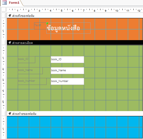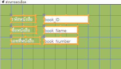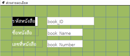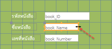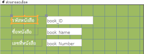 ฟิลด์ที่เรานำมาลงในส่วนรายละเอียดนั้น เป็นฟิลด์คอนโทรล เพราะคอนโทรลแบบนี้ผูกติดกับฟิลด์ข้อมูลจากตารางที่เราเลือกไว้นั่นเอง ฟิลด์คอนโทรลจะประกอบด้วย 2 ส่วนคือ ส่วนของป้ายชื่อกับส่วนของกล่องข้อความ การเลือกฟิลด์เพื่อปรับแต่งย้ายตำแหน่ง นั้นสามารถคลิกซ้ายป้ายชื่อทีละฟิลด์ได้ แล้วลากไปยังจุดที่ต้องการ