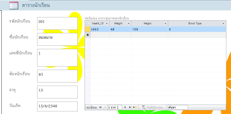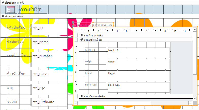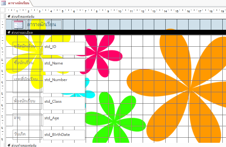 1) เป็นฟอร์มหลักขึ้นมาในที่นี้คือตารางนักเรียน ซึ่งเราจะเปิดทำงานในมุมมองออแบบ