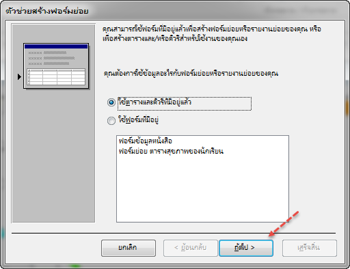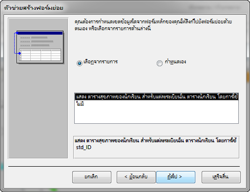 5) เลือกข้อมูลในการเชื่อมฟอร์มหลักกับฟอร์มย่อย จากนั้นกดถัดไป