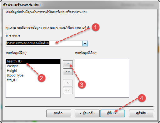4) เลือกตารางที่ต้องการสร้างฟอร์มย่อย ตามหมายเลข 1 จากนั้นเลือกฟิลด์ที่ต้องการแสดงข้อมูลตามหมายเลข 2 จากนั้นคลิกย้ายไปเขตข้อมูลที่เลือก ตามหมายเลข 3 จากนั้นกดถัดไปตามหมายเลข 4