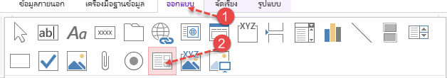 2) ไปที่ออกแบบตามหมายเลข 1 แล้วเลือกที่เครื่องมือ ฟอร์มย่อยหรือรายงานย่อย ตามหมายเลข 2