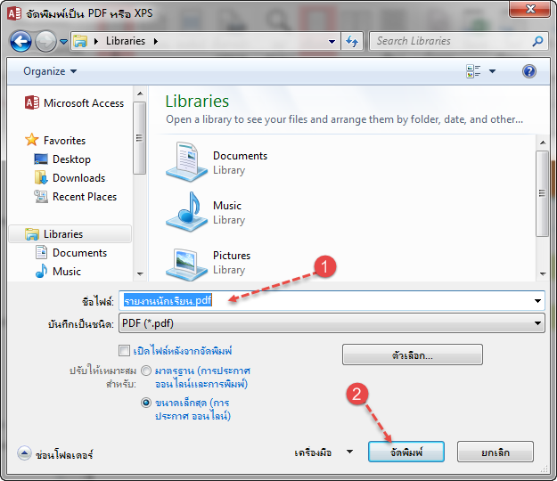 เลือกตำแหน่งที่เก็บไฟล์ จากนั้นตั้งชื่อรายงานตามหมายเลข 1 และกดจัดพิมพ์ตามหมายเลข 2 เป็นอันเสร็จสิ้นการบันทึกเป็นไฟล์ PDF