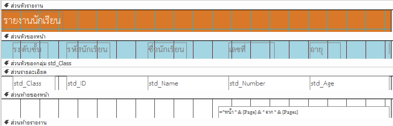 - ส่วนหัวของหน้า เป็นส่วนหัวของหน้ารายงานแต่ละหน้า โดยจะแสดงทุกหน้า ปกติแล้วจะเป็นป้ายชื่อฟิลด์