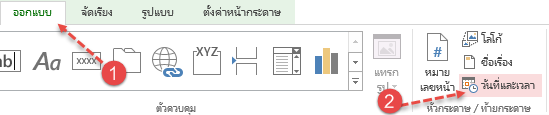 4) ส่วนขั้นตอนการใส่วันที่และเวลา เราสามารถใส่ได้โดย ไปที่ แท็บออกแบบตามหมายเลข 1 จากนั้นไปที่ปุ่ม วันที่และเวลา ตามหมายเลข 2