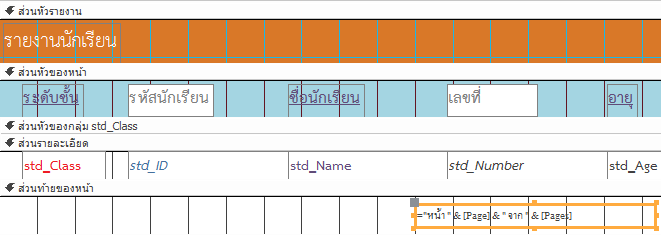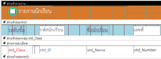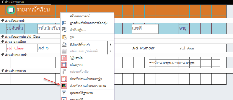 เมื่อเราไม่ต้องการทำจะมีส่วนหัวและส่วนท้ายของรายงานเราสามารถยกเลิกได้ โดย คลิกขวาที่รายงาน จากนั้นคลิกซ้ายที่ ส่วนหัว/ส่วนท้ายของรายงาน