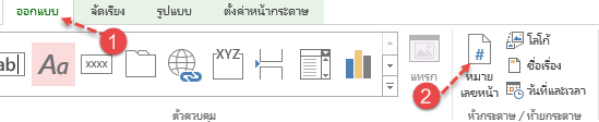 1) ไปที่แท็บออกแบบ ตามหมายเลข 1 จากนั้นไปที่ ปุ่ม หมายเลขหน้า ตามหมายเลข 2
