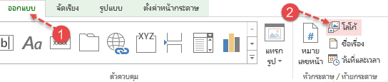 1) ไปที่แท็บออกแบบตามหมายเลข 1 จากนั้นไปที่ปุ่มโลโก้ ตามหมายเลข 2